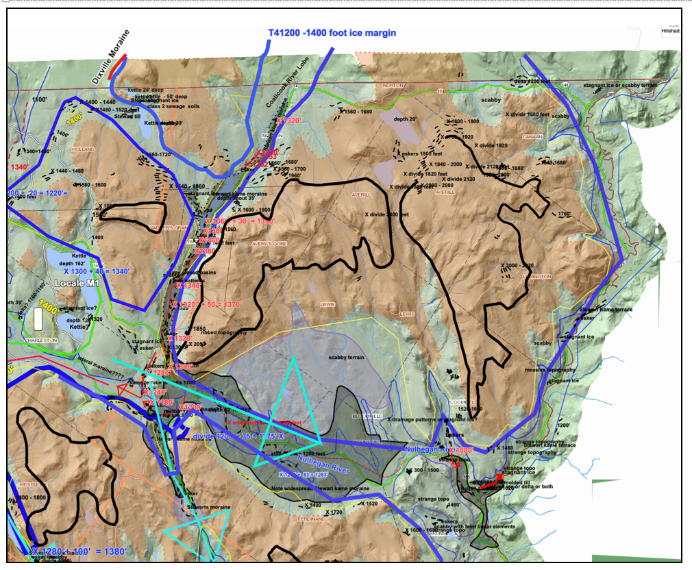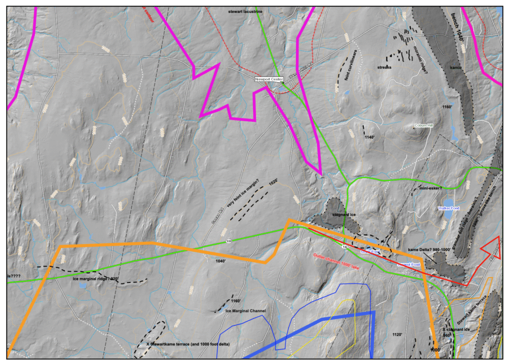 The following is a screen shot of an early version of VCGI mapping in this area, showing the 1400 foot(427 m) contour highlighted, giving a sense of the T4 ice margin correlation with the Dixville moraine.