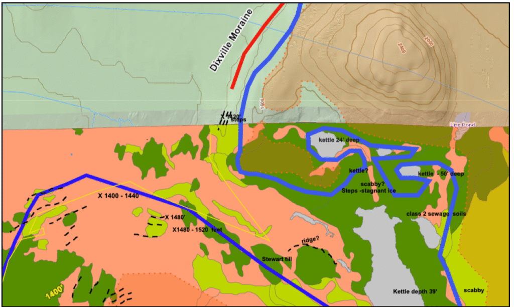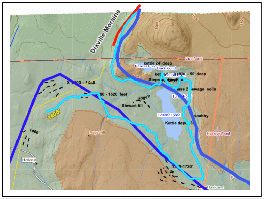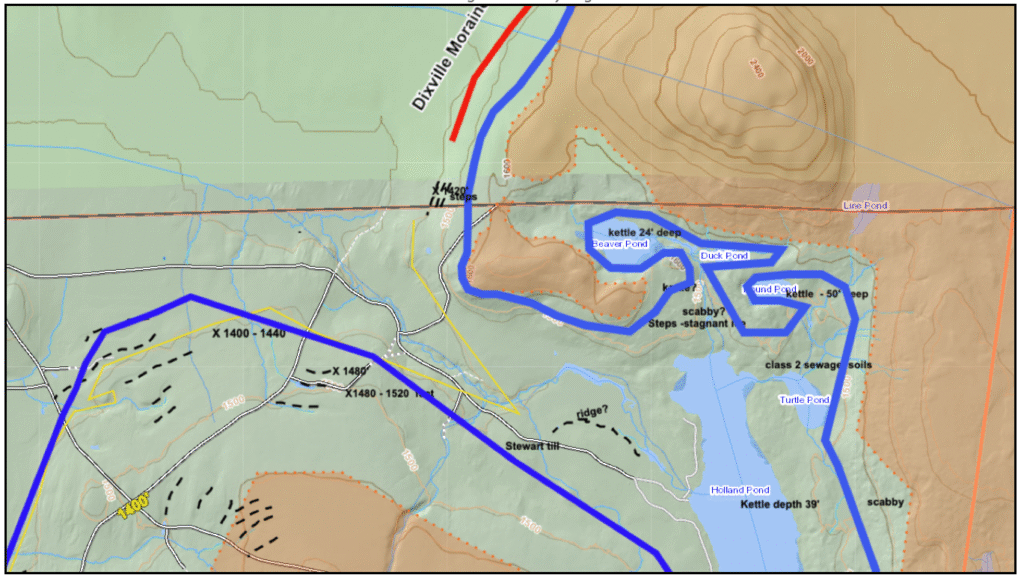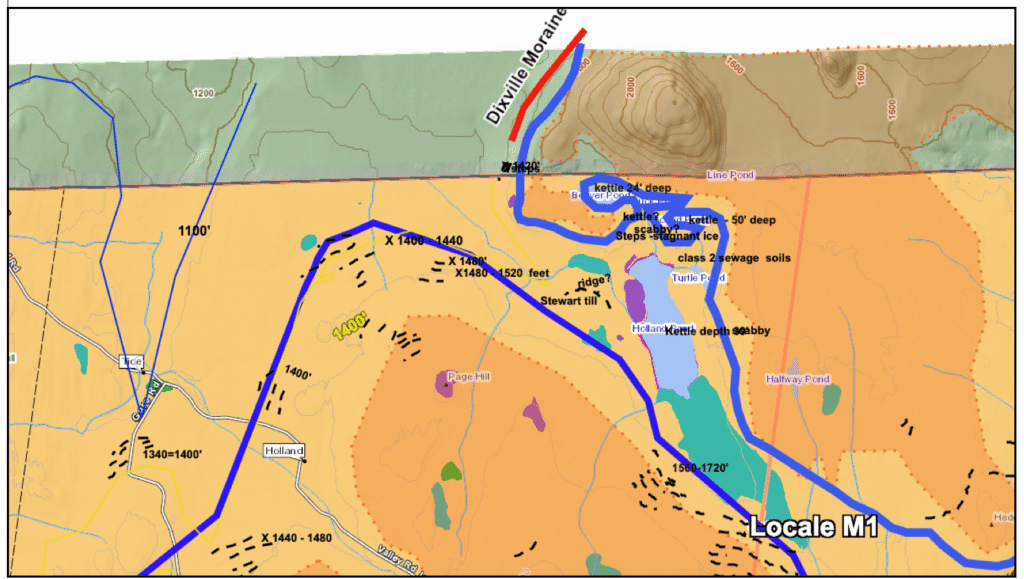To aid with this perspective the above map is marked with the approximate location of the Dixville moraine(short red line). The moraine is located near the base of the same upland massif area as previously described, a few miles northwest of Holland Pond.