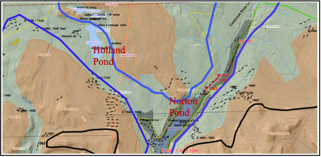 Just as Parent et Occhietti have noted that moraine segments in Quebec are discontinuous, the evidence of the ice margin immediately south of the Dixville moraine in Vermont, specifically in the vicinity of Holland Pond, other than Ice Marginal Channels, is scant.