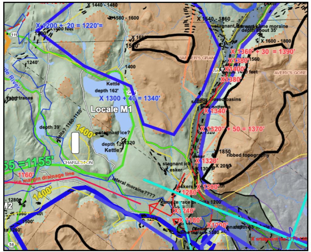 - The ochre color shaded area indicates elevations above 1600 feet, and the thin yellow line marks the 1400 foot(427 m) contour. These were marked in many places on VCGI to give a better understanding of the topography. The heavier blue line is the T4 ice margin. As previously noted, such markings on VCGI are challenging owing to the mechanical quirkiness of the website, and as a result, these features are approximate, not precise tracings.