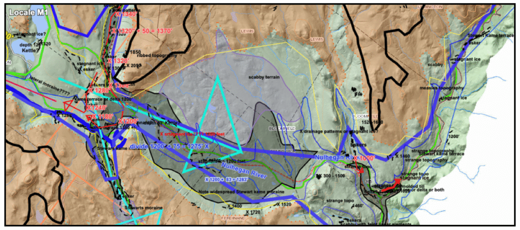 The VCGI map below identifies substantial stagnant ice deposits in the floor of the Clyde valley(gray shading), approximately at and immediately below the 1200 foot(366 m) elevation(marked by the thin blue line), extending across the drainage divide with the Nulhegan River Valley, with no evident spillway or outlet channel. Stewart and MacClintock mapped substantial, extensive kame moraine in the upper Clyde valley floor. VCGI mapping suggests a more limited extent of such deposits than Stewart and MacClintock’s map, but such deposits are substantial in the Clyde Valley and, over a wide margin extending from approximately the massif front to and across the divide and continuing down the Nulhegan Valley, at elevations ranging between 1200 and 1400 feet.