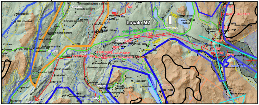 Again, this Drainage Line is traced as extending first from subglacial stagnant ice esker drainage in the T4 margin near Island Pond, including from stagnant ice masses in the Pherrins and Oswegatchie Basins, thence via subaerial drainage northwesterly down the Clyde Basin floor, to the ice margin, as marked in green on VCGI, to the Black Basin. This same Drainage Line is traced southward in the Black River Basin, as discussed further in Locale M3 below.