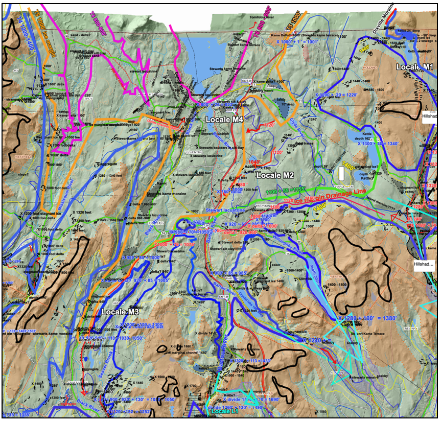 This screen shot shows Ice Marginal Channels as short dashed black lines, in some cases with local elevations added. This screen shot illustrates the conformance of the Ice Marginal Channels at the 1400 foot(427 m) level with the local physiography, in alignment with the Dixville moraine in Quebec. In a sense, this supports the Bath Tub Model, albeit in a limited area. At an early stage of mapping features in the Memphremagog Basin it was recognized that whereas stagnant ice deposits marking the ice margin at the 1200-1400 foot(366- 427 m) level extend across the Basin toward the Dixville moraine, these are generally below the elevation of the Dixville moraine. In contrast, Ice Marginal Channels along the 1400 foot(427 m) contour give a better alignment. This is taken as evidence for correlation of the T4 active ice margin with the Dixville moraine. However, based on Wagner reconnaissance in Quebec it appears that ice marginal features nearby across the border in Quebec likewise include sprawling, scattered stagnant ice deposits.