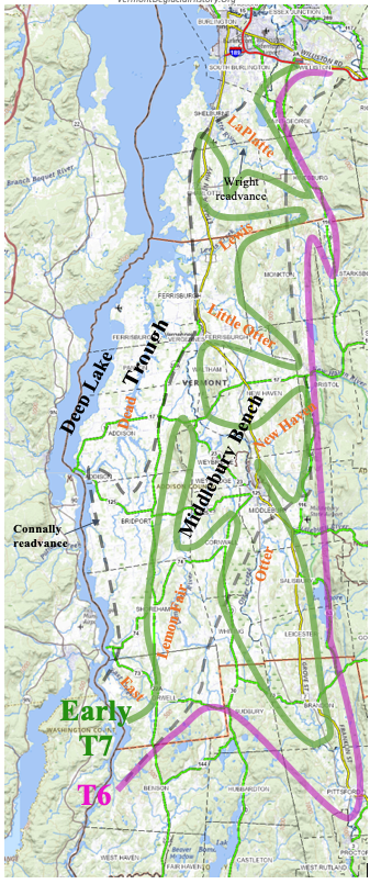 In fact, as discussed below, the evidence from this re-examination, as discussed below, indicates that such early calving in late T6 time was not possible. Instead, the new evidence indicates that in T7 time the Champlain lobe extended far to the south, as suggested by the above map, such that calving in the Deep Lake area was not possible at T6 time. Instead, again based on the new evidence, the lowering of water levels from Coveville to Fort Ann levels in early T7 time triggered the beginning of calving and associated ice streaming of the long convex T7 lobe, leading to the collapse and demise of the ice sheet in Vermont by rapid ice margin calving recession to and beyond the Quebec border by the end of T7 time. The evidence as presented below documents this calving and collapse of the Champlain lobe, which again was triggered by proglacial water level lowering from Coveville to Fort Ann levels, though, as noted above in my earlier report, may also have been affected by the draining of Lake Mansfield and the breakout of Lake Iroquois in the Ontario Basin into the Champlain Basin at Covey Hill.