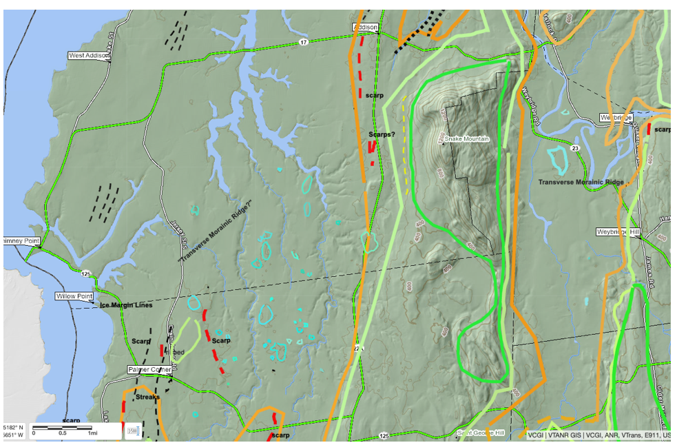 As can be seen on the above Batchelor and Dowdeswell illustration, calving ice streams are also associated with  and marked by other features as part of the geological record, specifically  “Transverse retreat moraines” and  “stream-lined lineations.”  Whereas the latter  are depicted on their  illustration as being located downgradient from the transverse moraines this  was done for graphical convenience. As described by the authors, such lineations tend to form beneath the ice, upgradient from the grounding line. As discussed above, the linears southwest of Vergennes and northwest of Snake Mountain are identified as possible “stream-lined lineations,”  more specifically referred to in the previous 2025 report as  possible  Mega-Scale-Lineations. Important information regarding these features was identified in the present field study, as discussed below.