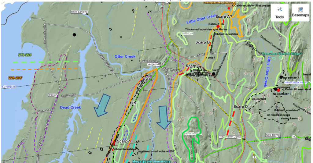 The Otter Creek Basin is a major basin in Vermont, as a re-entrant basin penetrating the Middlebury Bench. Unlike other re-entrant basins which extend into the foothills and Green Mountains in a west to east direction, the Otter Creek basin extends in a generally southeastward direction into the Vermont Valley. As previously indicated the Champlain lobe was bifurcated, with a sublobe in the Otter Creek basin into the Vermont Valley, separated from the main lobe on the Trough floor by the Taconic Mountain uplands. Both lobes were relatively robust. The blue colored arrows on the above map suggest these lobes. As a consequence of their orientation these lobes were more directly connected with the parent Champlain lobe to the north, in contrast to other re-entrant basins. This resulted in more vigorous ice streaming in the Otter Creek Basin as compared to other basins to the north, as marked by Scarps along ice stream shear margins.