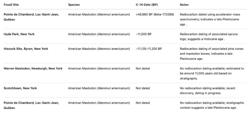 Mammoth and mastodon remains have been found in Pleistocene deposits in various places in eastern North America, including in Vermont, Quebec, New York, and Nova Scotia.  The  following table gives some example C 14 dates, thanks to ChatGPT: