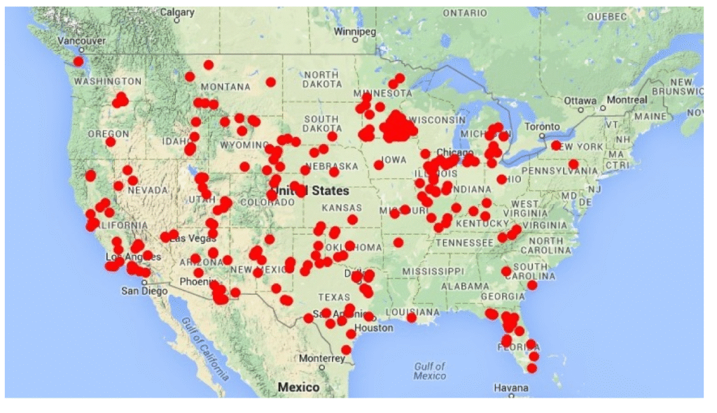 The following ChatGPT provided map shows mammoth finds in the United States portion of North America: