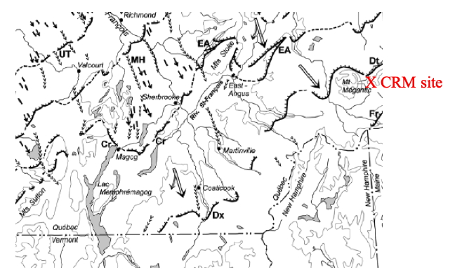 The CRM site is said to include stone tools and cultural traces dating back ~12,000 years, connected to early human occupation associated with the recession of the Laurentide Ice Sheet.  Projectile points include  a mix of local and long-distance provenance raw materials, the main ones being Red Munsungun chert (northern Maine), Rhyolites from northern New England, notably Mount Kineo (Maine) and Mount Jasper–Jefferson (New Hampshire) , and local volcanic rocks (rhyolite / trachyte / phonolite) from the Montagne de Marbre area. Thus, a southwestward migration route along the ice margin from Quebec into Vermont  may have existed. The ice margin positions which are identified in this VCGI report provide more specific information than previously available about possible early human migration pathways into and around Vermont,and deserve further scrutiny in this context. .