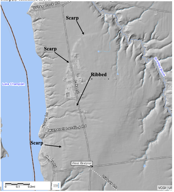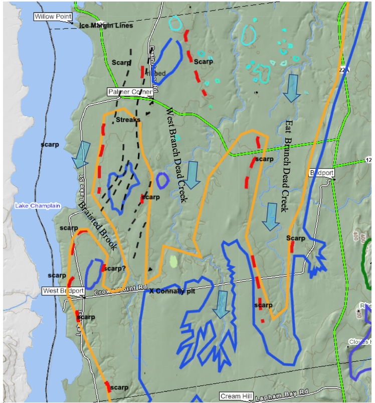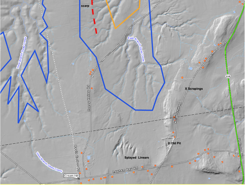 The “Splayed Linears” are distinctive features on a prominent bench, reminiscent of similar Splayed linears elsewhere along the late T7 ice margin, as for example just east of Vergennes as discussed above. Again, the exact mechanism of formation of these features is uncertain, but these and the associated bench are believed to have formed along the late T7 ice margin lobe near its frontal tip in Dead Creek basin. Nearby is an old gravel pit. This pit is no longer active and is badly slumped with no exposure of the strata or structures. However, the material in the pit floor and walls includes mostly silt and fine sand but separate masses of sand and in places gravelly material with highly rounded pebbles are found, which are typically associated with gravel. Soils on the land surface on the terrain around the pit are silt and clay. This deposit is taken to be part of a Ribbed Lacustrine deposit, formed along and by the late T7 ice margin. Nearby to the north is an area of shallow bulldozer “scrapings,” where similar materials scattered on the land surface are evident. The nob along the west side of N. Cream Hill Road is a bedrock nob.
