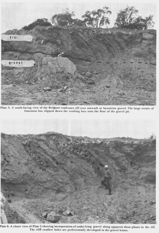 Connally indicates the photos are looking south, meaning east and west are to the left and right, respectively. His captions indicate that the exposure shows till overlying “outwash or lacustrine gravel” with “incorporation of underlying gravel along apparent shear planes in the till.(emphasis added)” Whereas the three dimensional orientation of the shear planes can not be specifically determined from the two dimensions given by the photograph, it is obvious that in general shear was west to east. As can be seen by the above map, the location of the pit is along the late T7 margin, near the headwaters of the West Branch Dead Creek. Multiple Scarps in the area suggest the main Trough ice stream was nearby to the west, with sublobes into Braisted Brook and West Branch Dead Creek Basins, again in late T7 time. Connally’s gravel pit is at the headwaters of these basins where multiple sublobe ice streams converged. Thus, it is likely that Connally’s “readvance” is actually instead a lateral shear margin of these ice streams.