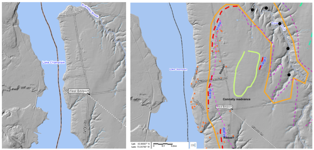 This area is especially important in as much as Connally reported a gravel pit exposure near West Bridport, with structurally deformed, interbedded till, gravel, and ponded water silt-clay strata, which he interpreted as indicating a readvance, his so-called “Bridport Readvance.” This readvance has been subsequently referred to in various reports and thus has become part of the literature for regional deglacial history. However, DeSimone and LeFleur, who subsequently attempted to verify this feature, were unsuccessful, leading them to call into question the validity of this readvance. In fact, Connally states that in his opinion, this was a minor readvance. Regardless, of the truth of the matter in regard to a “readvance,” photographs of this deposit given in Connally’s report clearly show deformation of till and associated other sediment, making it clear that, so to speak: “something was going on in the West Bridport area.” Based on an inferred location of the pit near West Bridport, and the close proximity of a prong of bouldery marine silts and clays nearby, in my previous report this readvance was previously correlated with the same T8 margin as the readvance identified by Wright in Charlotte and the aforementioned readvance in the Missisquoi Basin. Thus, the “Bridport readvance” added to the evidence for a long lobe in T8 time.