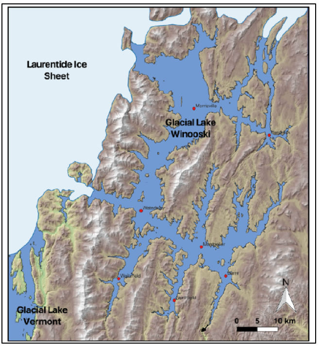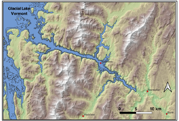 Springston, G., Wright, S., and Van Hoesen, J., 2020, Major Glacial Lakes and the Champlain Sea, Vermont: Vermont Geological Survey Miscellaneous Publication VGSM2020-1, Scale 1:250,000.