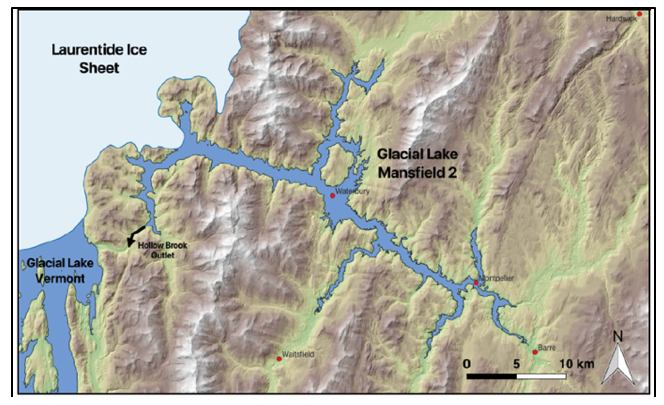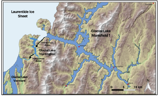 • Lake Mansfield 1, with an ice dam further westward and an outlet at Gillett Pond with drainage westward into a lake in the Huntington Basin, which in turn drained across the divide between the Huntington Basin and Hollow Brook Basin, with further drainage westward into Lake Vermont in the main Champlain Basin marked by a delta at the Coveville level at South Hinesburg.