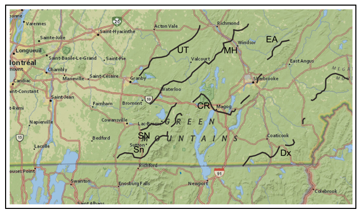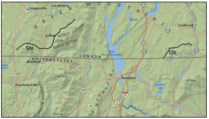 The moraines are indicated by the sinuous black lines, with the Sutton moraine(Sn) and the Dixville moraine(Dx) being most pertinent. Owing to the fact that different maps are based on various cartographic systems, the transposition from Parent et Occhietti ’s map locations to this map gives a reasonably good sense of their settings, but nevertheless is imprecise.
